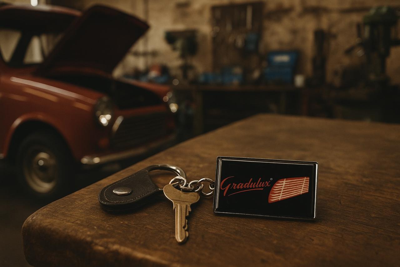Plaque rectangulaire métal avec logo GRADULUX sur fond noir, dôme époxy brillant. Anneau et chaîne robustes – le compagnon idéal de vos clés de collection.
